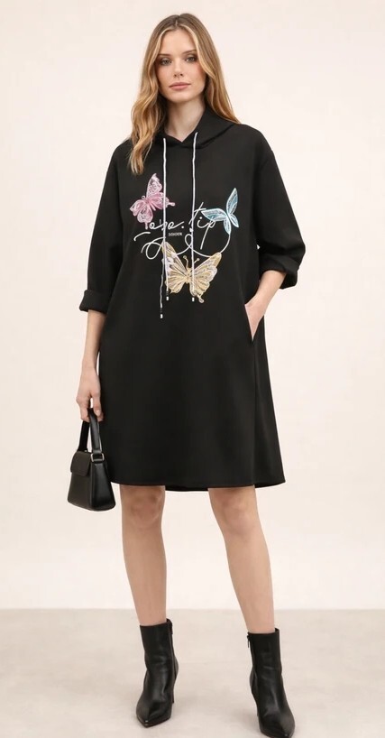 Tyylikäs ja rento perhoskuvioitu hupparimekko on täydellinen valinta arkeen, vapaa-aikaan ja viileisiin kevät- ja kesäiltoihin. Kevyt ja miellyttävän joustava materiaali tuntuu pehmeältä päällä ja laskeutuu kauniisti. Rento A-linjainen malli antaa liikkumavapautta ja sopii monenlaisille vartaloille.